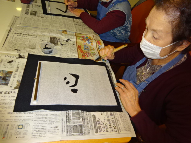 今年1年を振り返り、書道を行いました。 スラスラ書ける方もいれば、頭を悩ませている方もいらっしゃいました。 皆さん、思い思いの一文字を書きました。