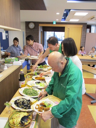 初の試みということでスタート時間が遅れてしまいましたがお食事は大盛況でした。 ご入居者の皆様、ご家族が一緒の一時を楽しんで頂けたら幸いです。 十数種類のメニューがずら~り。 「GOOD」だよとお言葉頂戴しました。