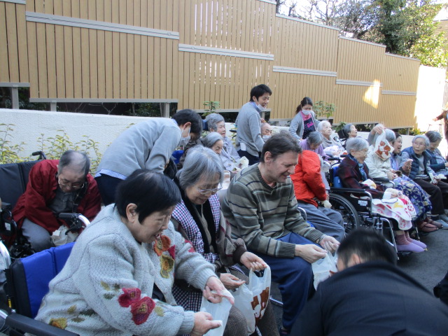 地域交流行事「節分豆まき」を行いました。昨年は、開設1周年記念行事として行い、お越し頂いた方から 「楽しかった」との言葉をたくさん頂戴し今年も開催しました。特養馬込と言えば恒例の「豆まき」と思って 頂けるよう育てていきたいです。気温の低い日が続き、前日の雪予報も心配されましたが当日は晴れ間もあり、 200名以上の方がお越しになりました。 お昼にはご入居者の豆まきを! 職員ふんする赤鬼、青鬼が登場し「鬼は外~」と鬼退治?をして福を招き入れました。 14時の開場前から子供たちが来所し温かい甘酒とぜんざいをふるまいました。 今年も来賓の方に福の神となって頂きました。 右から 馬込西二丁目町会会長 河原義幸 様 大田区福祉部介護サービス推進担当課長 黄木隆芳 様 馬込地区民生児童委員協議会会長 常安雅彦 様 馬込特別出張所所長 柞木尚 様 子供たちによる鬼退治!子供たちの勢いに鬼は改心し、これまでに盗んだ(?)お菓子を子供たちに返すと約束し 枡いっぱいにお菓子を詰めてもらいました。豆まきのあとには、揚げたてホクホクコロッケも! 今年も大人気、大田区の「オーちゃん」 お越し頂いた皆様ありがとうございました。無事鬼を退治することができました。皆様に福が舞い降りますように!