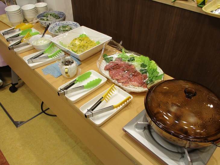 平成29年度1回目の家族懇談会を開催しました。 懇談会後には今年もスタミナバイキング!今回のメインはローストビーフ。 昨年よりもご参加頂いたご家族も多かったです。一緒に召し上がって頂きました。 被服販売と北海道物産展も同時開催しました。ご家族と一緒に実際の商品を手に取り、良い悪いと言いながらの買い物。 親子の会話も楽しんで頂けたのではないでしょうか。