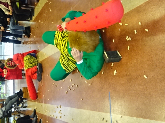 今日は節分です。 お昼には白豆ごはんが出ました。 「鬼のパンツ」を皆さんと踊って体操の代わりに身体を動かし、 年男年女のご利用者さんには裃を着ていただき記念撮影。 最後は皆さんで鬼退治ーーーー!